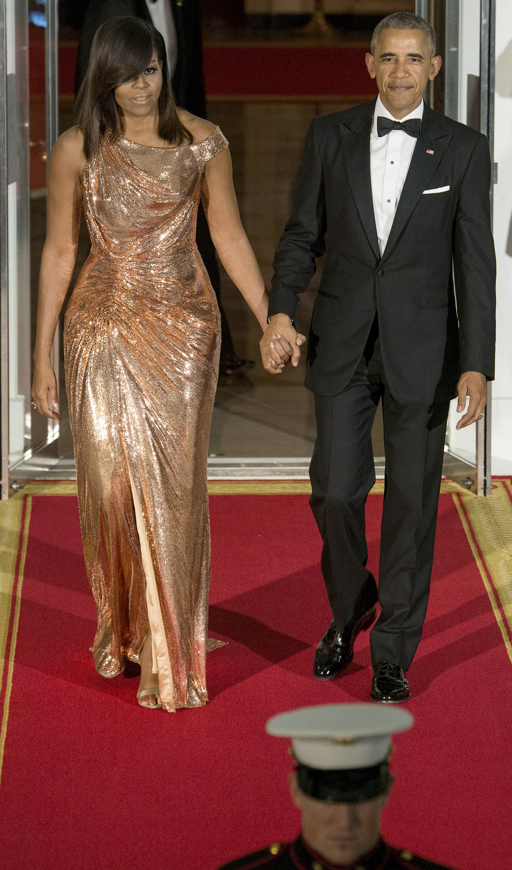 As the man of the hour, Obama wore a sleek Fendi Hortensia floral print long sleeve button-up shirt, retailing for $650 and available at Nordstrom. He paired the look with white slacks and a festive black beaded necklace and looked cool and comfortable all night long.
