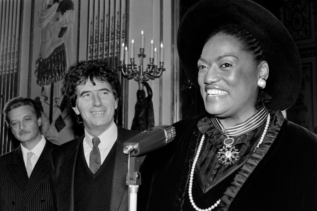 In this photograph taken on June 21, 1990, US soprano Jessye Norman (L) speaks with then French Prime Minister Michel Rocard after she was invested with La Croix de Chevalier de La Legion d’honneur in Paris.
