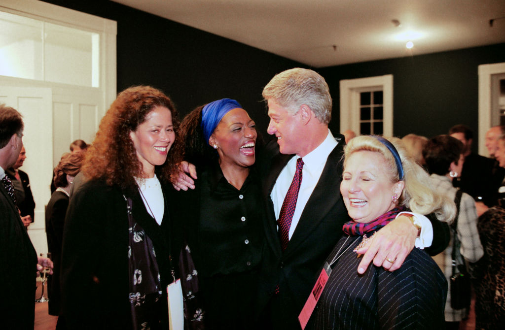 President Bill Clinton celebrates with opera singer Jessye Norman and actress Anna Deavere Smith on election night backstage at the Old State House, Little Rock, Arkansas, November 5, 1996.